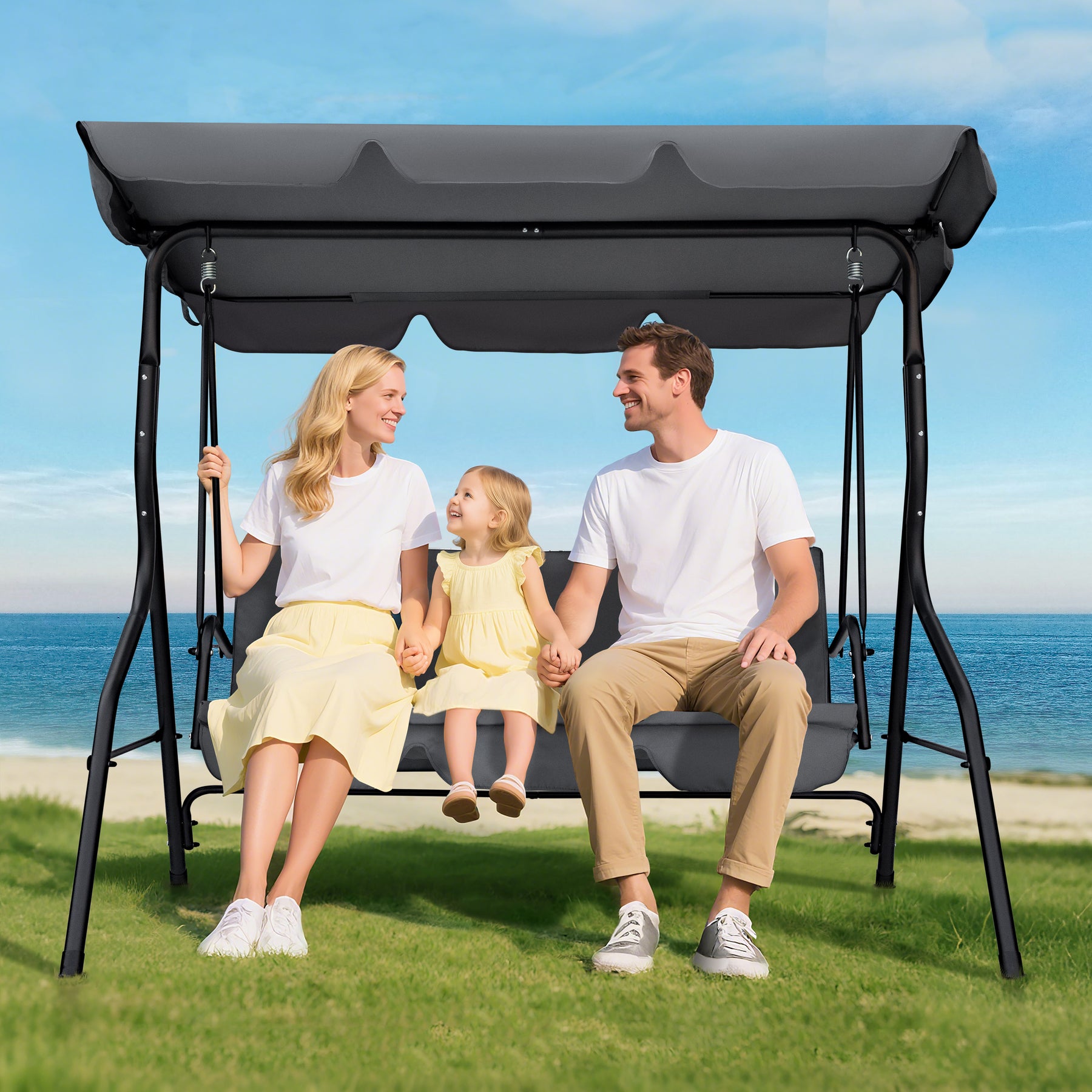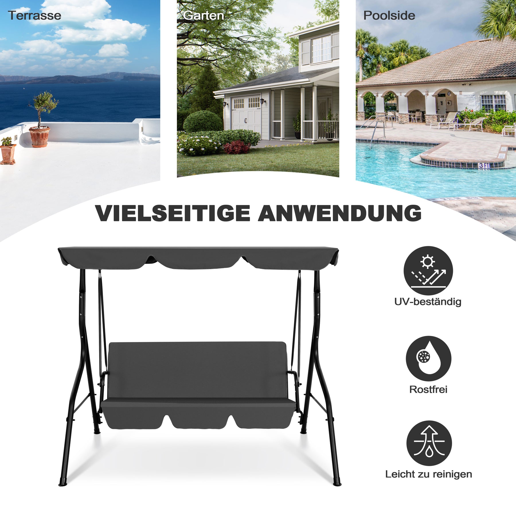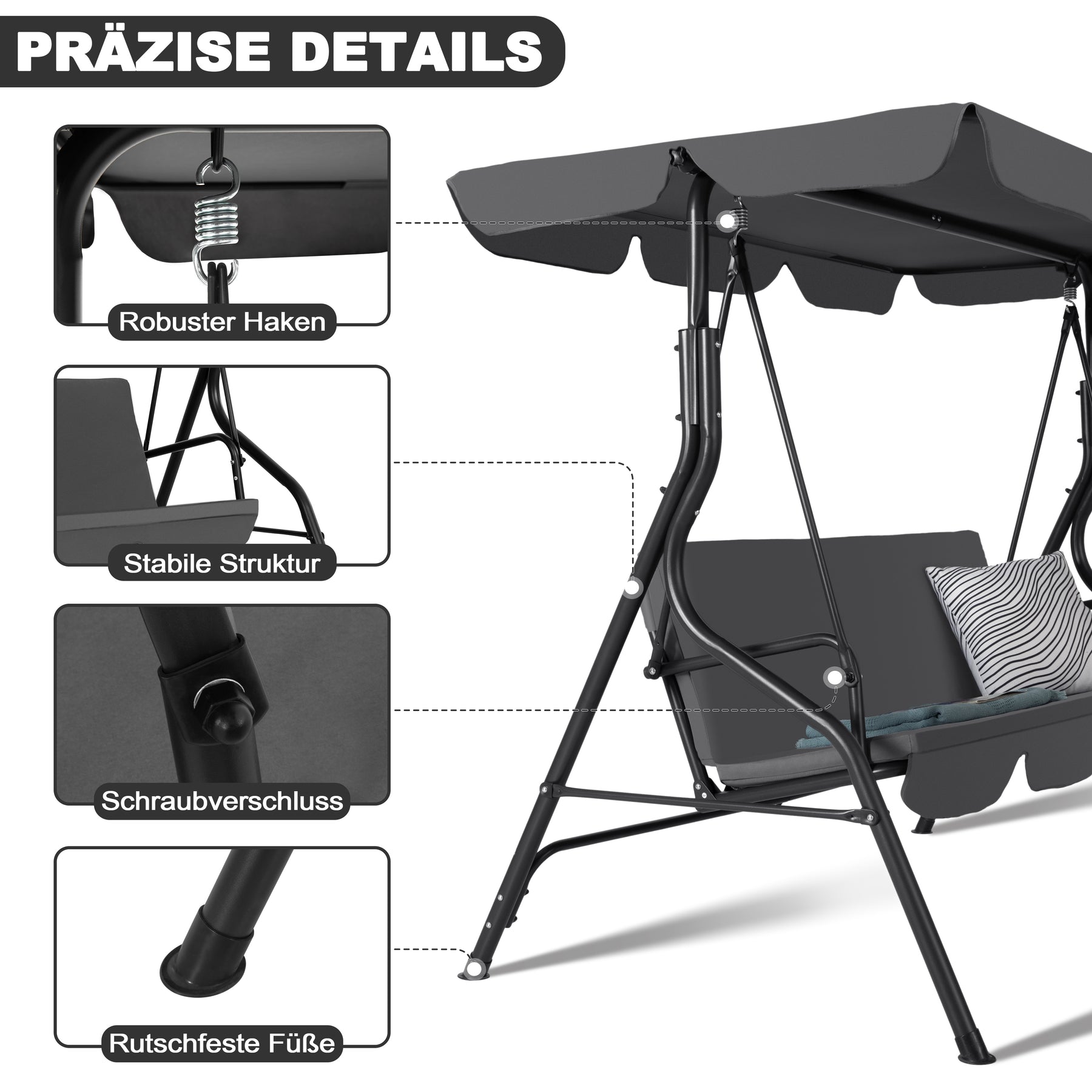 Genießen Sie das Leben in vollen Zügen! Unsere Avestar Gartenschaukel ist die ideale Wahl für Sie. Das Gestell der Gartenschaukel für drei Personen besteht aus Stahlrohren mit einer dunkelgrauen Kunststoffbeschichtung. Das Vordach dieser Gartenschaukel lässt sich in mehreren Winkeln verstellen und bietet optionalen Sonnenschutz den ganzen Tag lang. Zudem ist es staubabweisend und Spritzwasserabweisung. Während Sie sich auf dieser Gartenschaukel entspannen, sorgen die rutschhemmenden Kunststofffüßen für Sicherheit, während das weiche Sitzkissen den Komfort erhöht und ein perfektes, sanftes Schaukelerlebnis im Freien bietet.