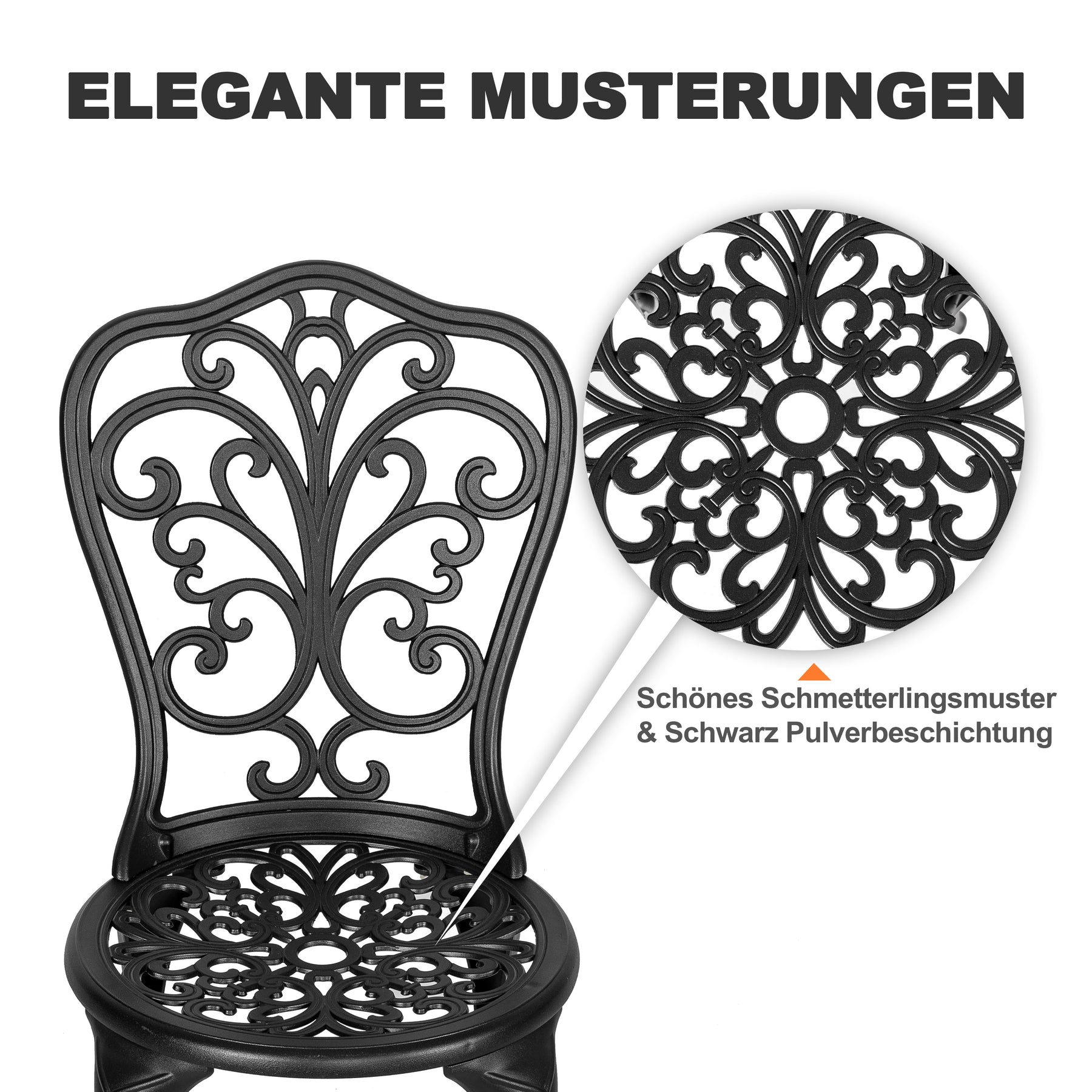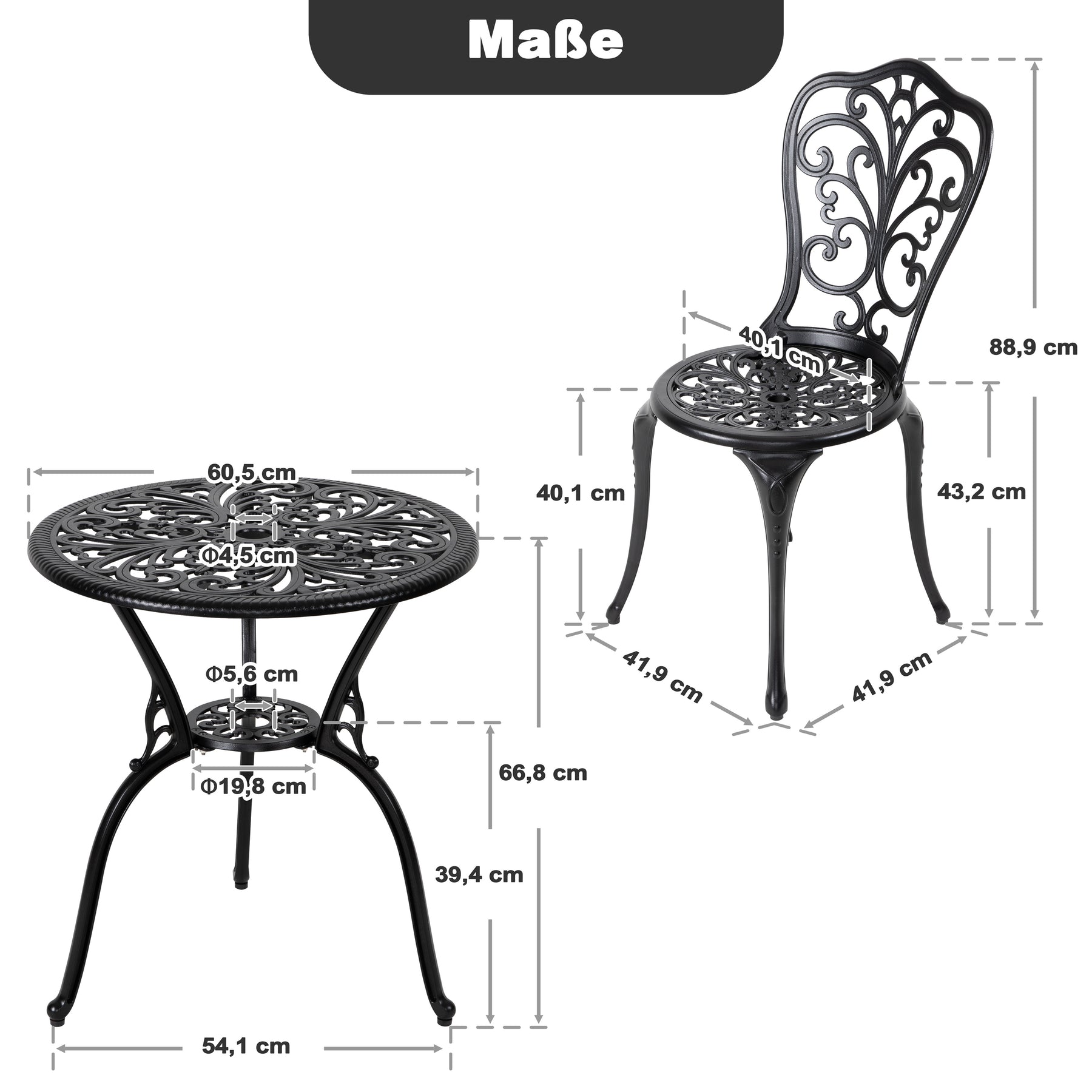 Das 3-teilige Terrassenset von Avestar für den Außenbereich besteht aus einem 60,5 cm Durchmesser-Rundtisch aus Aluminiumguss und zwei passenden Stühlen aus Aluminiumguss ohne Armlehnen, die mit einer beeindruckenden schwarzen Beschichtung versehen sind. Dieses Set ist aus hochwertigen Materialien gefertigt, dauerhaft und komfortabel. Die Stühle verfügen über eine bequeme, geschwungene Rückenlehne und Sitzfläche sowie über stabile Standbeine, die einen sicheren Stand gewährleisten. Der Tisch ist sowohl stabil als auch leicht, sodass Sie ihn je nach Bedarf mühelos in Ihrem Außenbereich verschieben können. Mit seiner kompakten Größe eignet es sich perfekt für jeden Außenbereich und ermöglicht es Ihnen, einen gemütlichen Essbereich im Bistro-Stil zu schaffen, wo immer Sie möchten. Egal, ob Sie ein romantisches Abendessen zu zweit veranstalten, eine Tasse Kaffee mit einem Freund genießen oder einfach nur in Ihrem eigenen kleinen Paradies entspannen möchten – dieses Set ist die ideale Wahl.