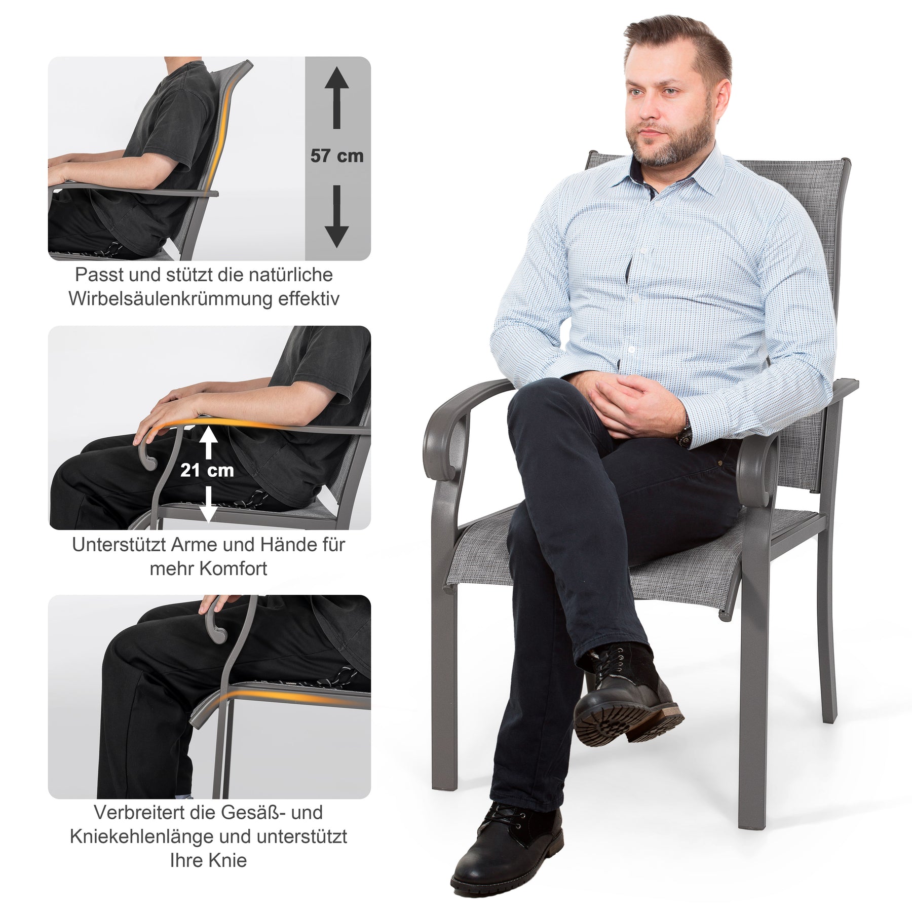 Maßgeschneiderte Lehnen: Rücken- und Armlehnen lindern Verspannungen, rutschfeste Füße schützen Boden.